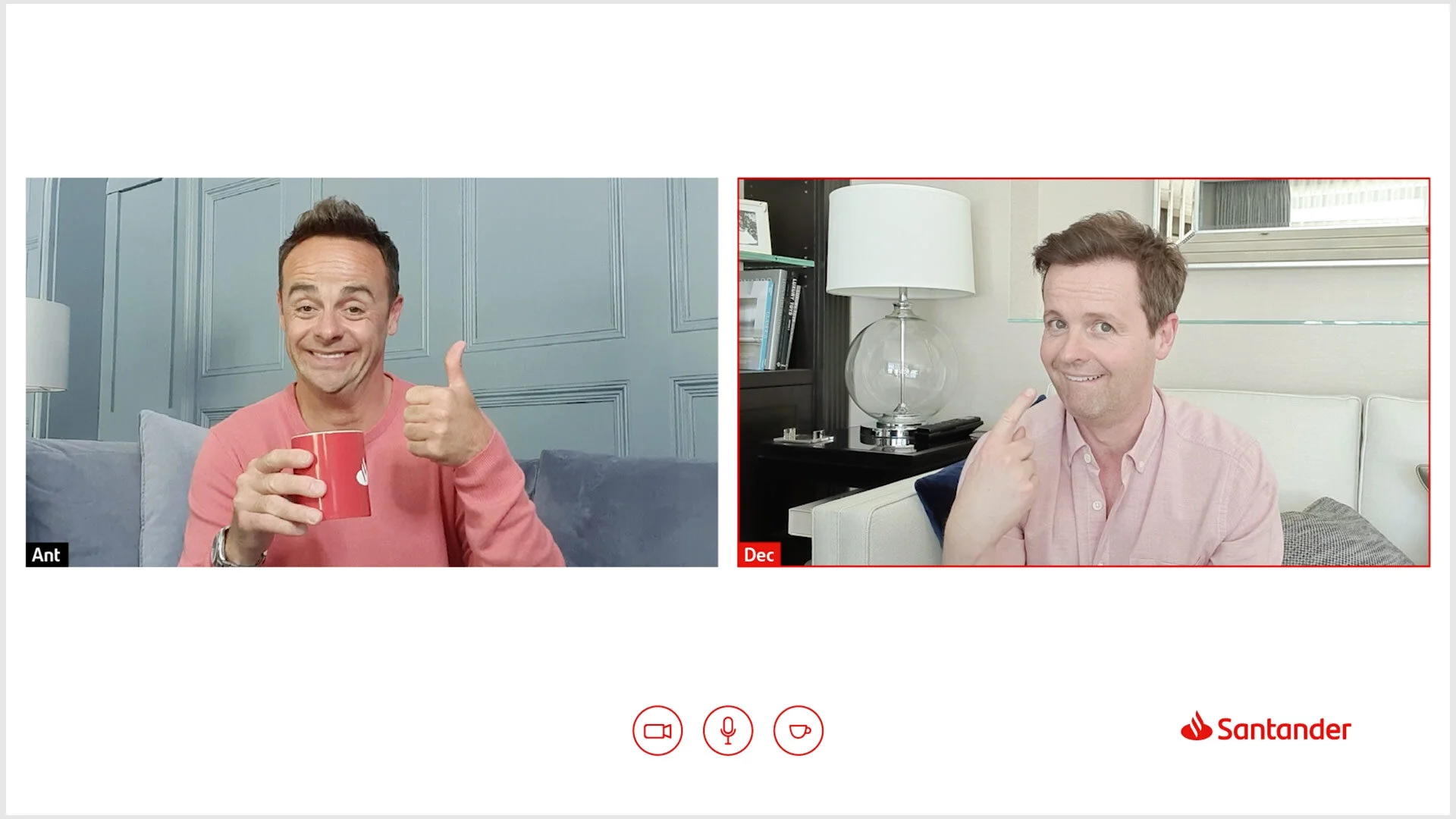 During lockdown, loneliness among the elderly surged as many were forced to isolate from family and friends. With Santander branch staff unable to work due to closures, we had an idea: we invited Santander employees to connect with elderly customers for a virtual cup of tea and a weekly chat. To promote the initiative, we enlisted brand ambassadors Ant and Dec, creating a film that explained how it all worked—over a virtual cuppa, of course.